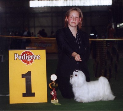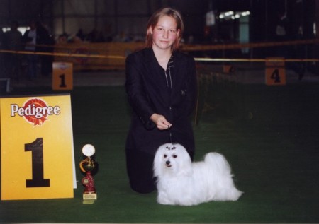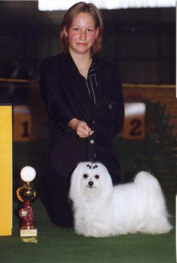 Hier sehen Sie unseren Rüdi vorgeführt von Kati Wilke. An diesem Tag erlangte er das V1 und Reserve-CACIB. Kati zeigte ihn beim Juniorhandling und machte da selbst den 5.Platz von 10 Junioren.