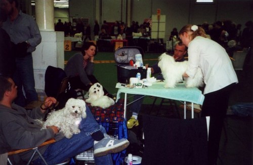 gerade eine junge Hündin für ihren Auftritt im Ring vorbereitet.