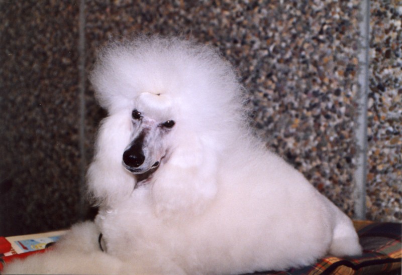 “Desdemona With vom Traumsee” vorm richten am Ringrand. Ihre Züchter und Besitzer sind Sabine und Norbert Preuss.