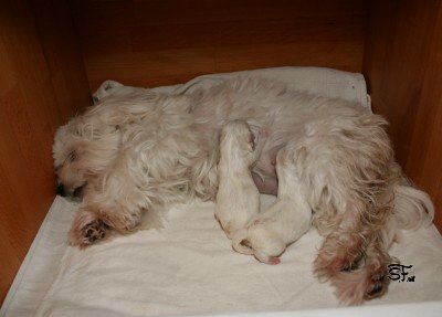 Jacy mit ihrem ersten Welpen und rechts kurz nach beendeter Geburt glücklich und müde! |