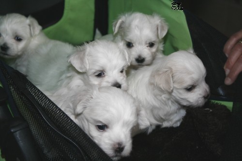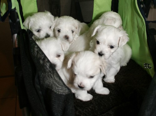 Erster kleiner Ausflug im Kinderwagen. Alle H- und I-Wurf Kinder auf einem Haufen.