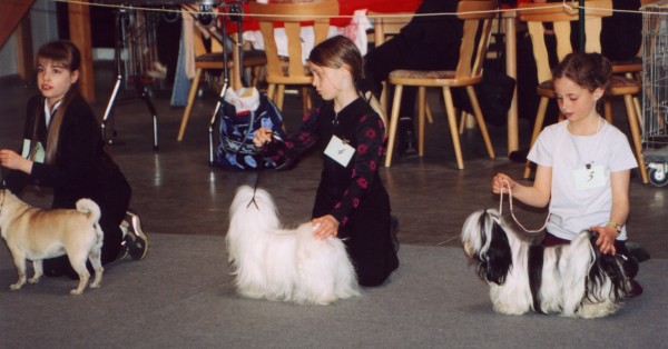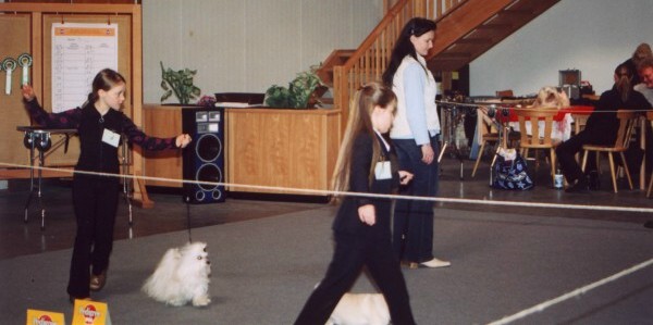 Wilsdruff April 2003 - Erst muß Lisa den Hund richtig aufbauen und präsentieren und dann müssen alle gemeinsam laufen und ihr Hunde im Lauf zeigen.